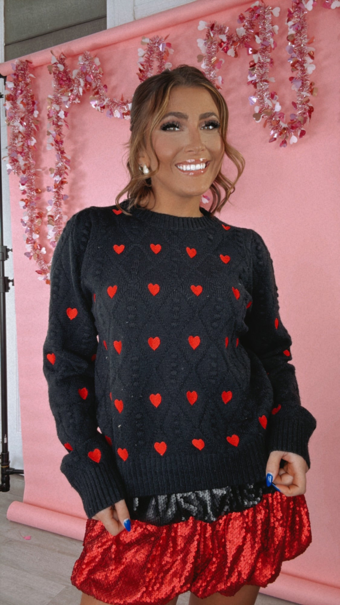 XOXO Heart Embroidered Pom Detailed Sweater, Black/Red