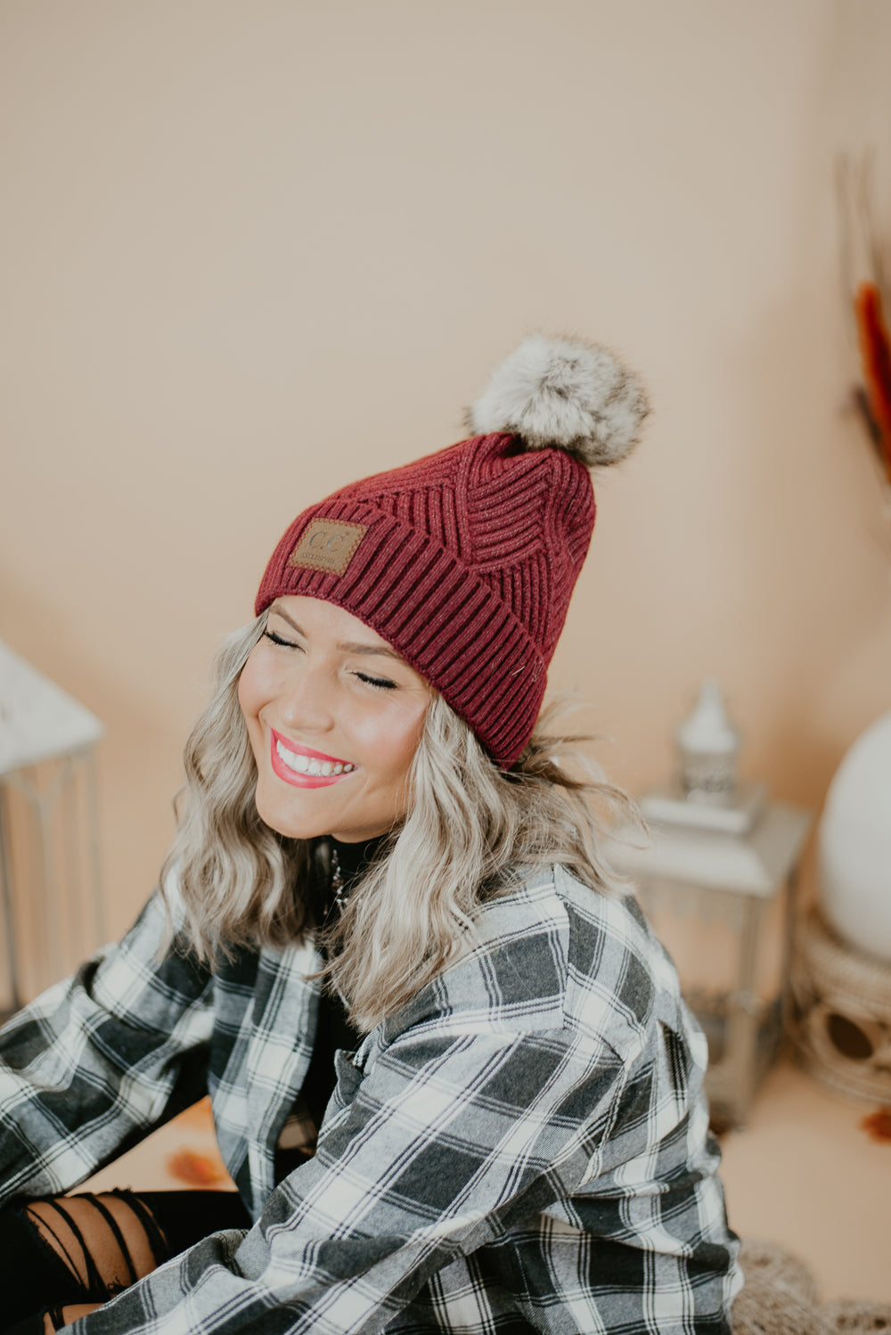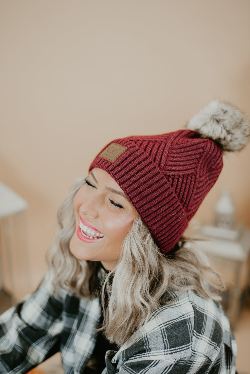 CC Leather Patch Beanie, Burgundy