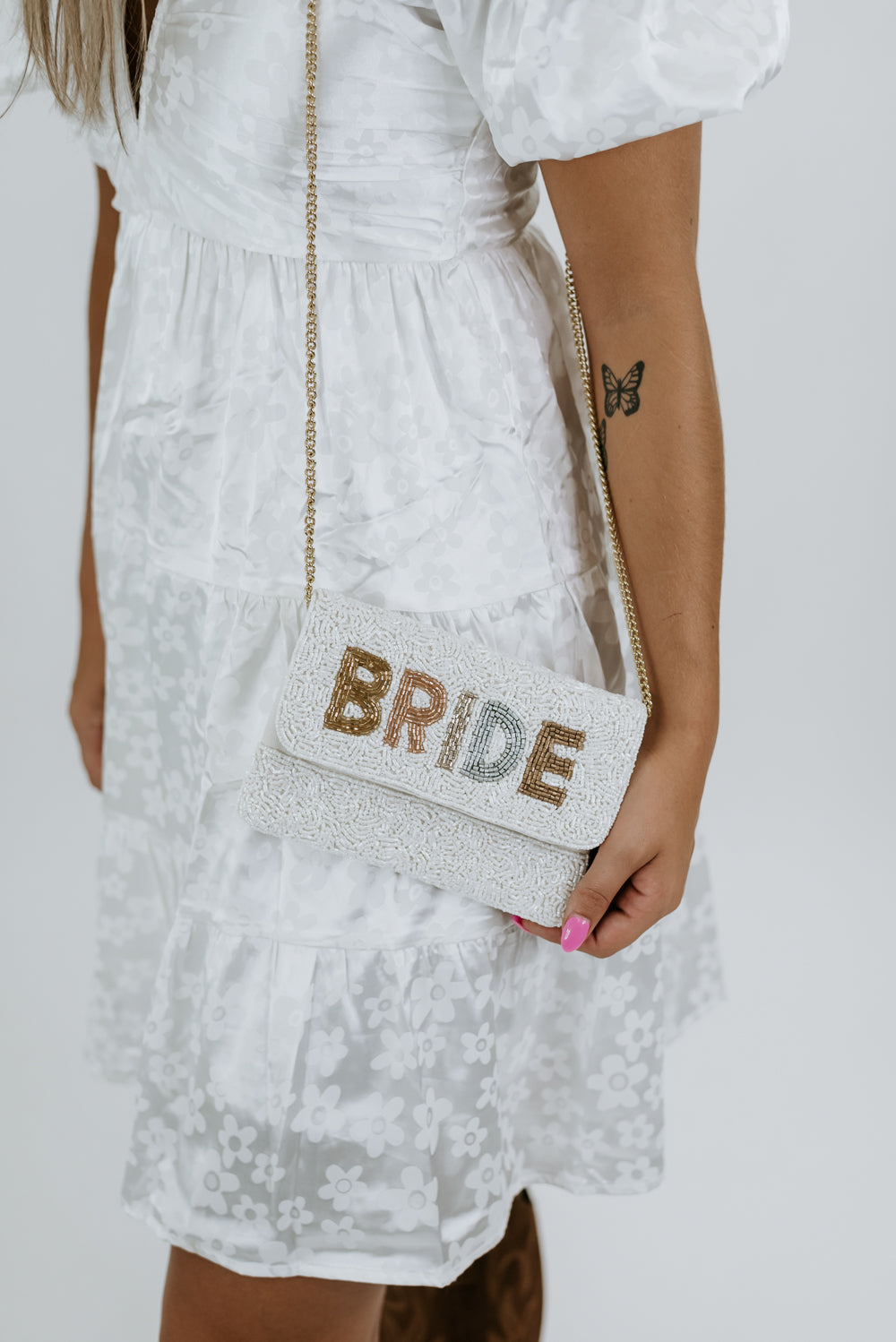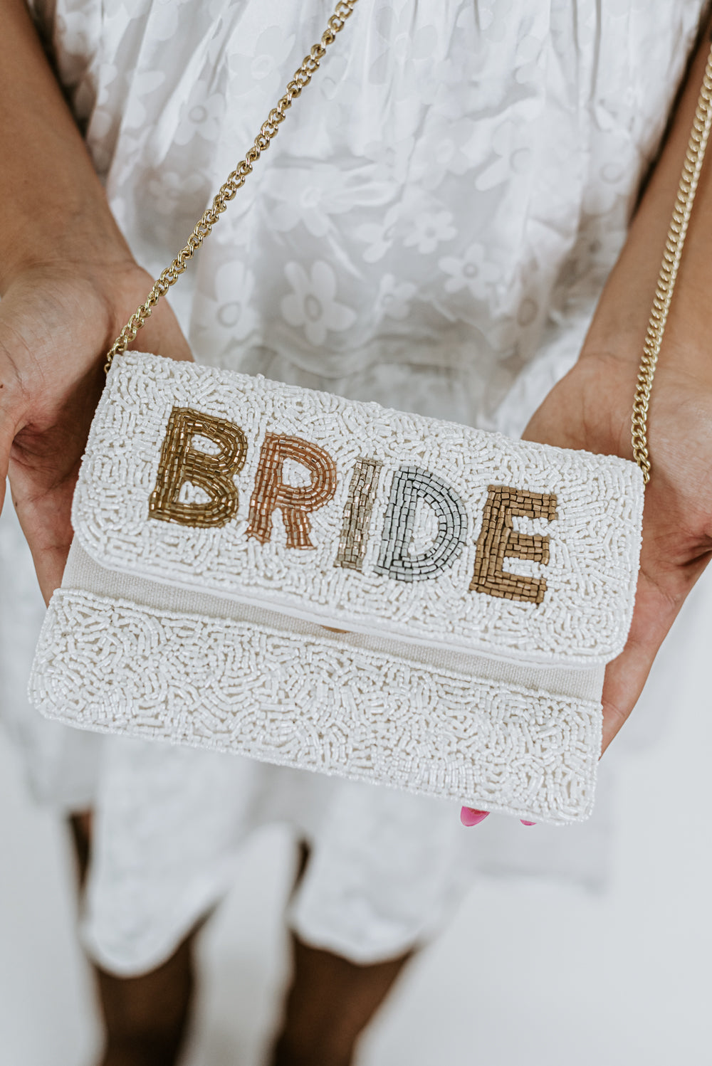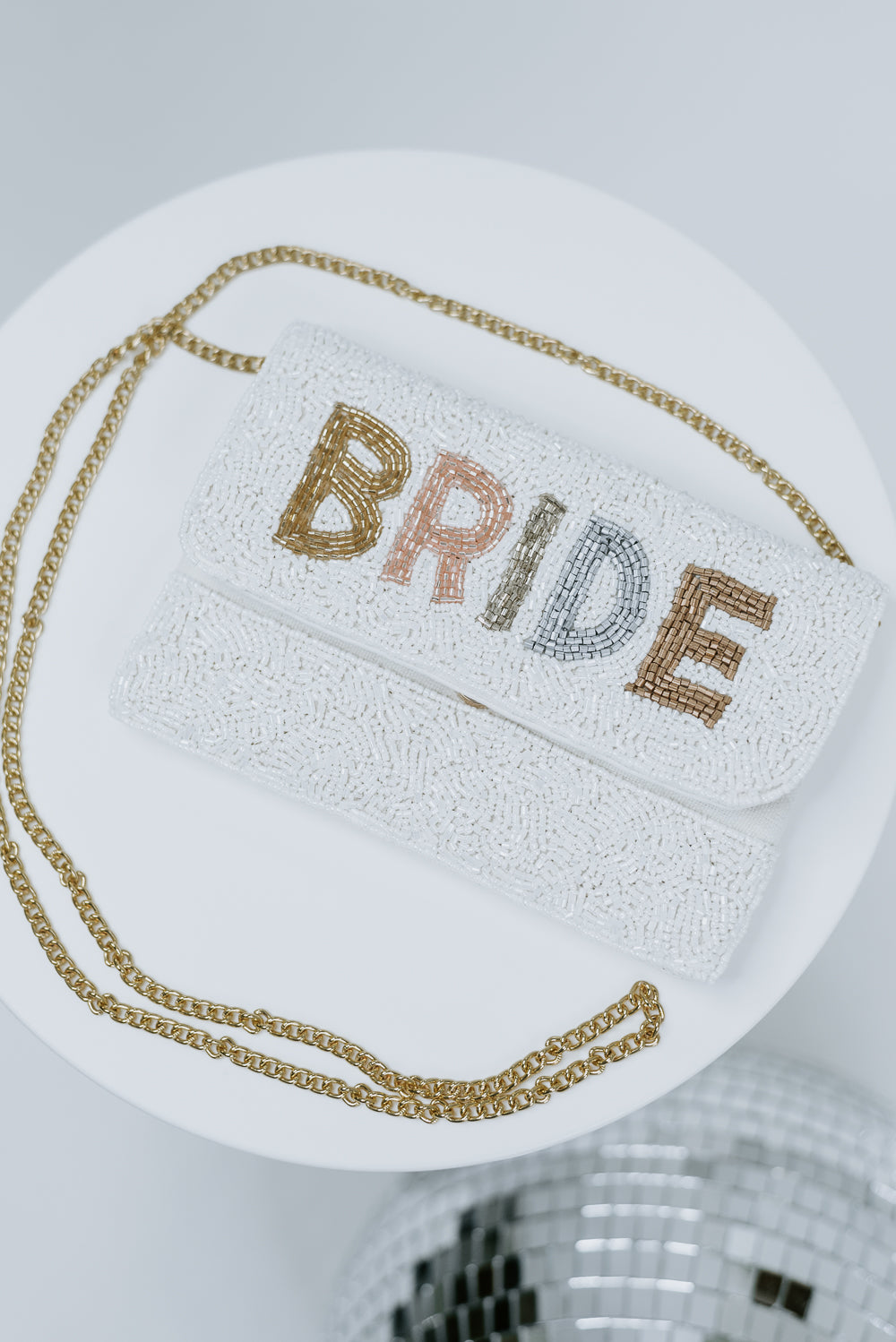Fully beaded bride clutch with gold, champagne, rose gold, and silver detailing for an extra pop.