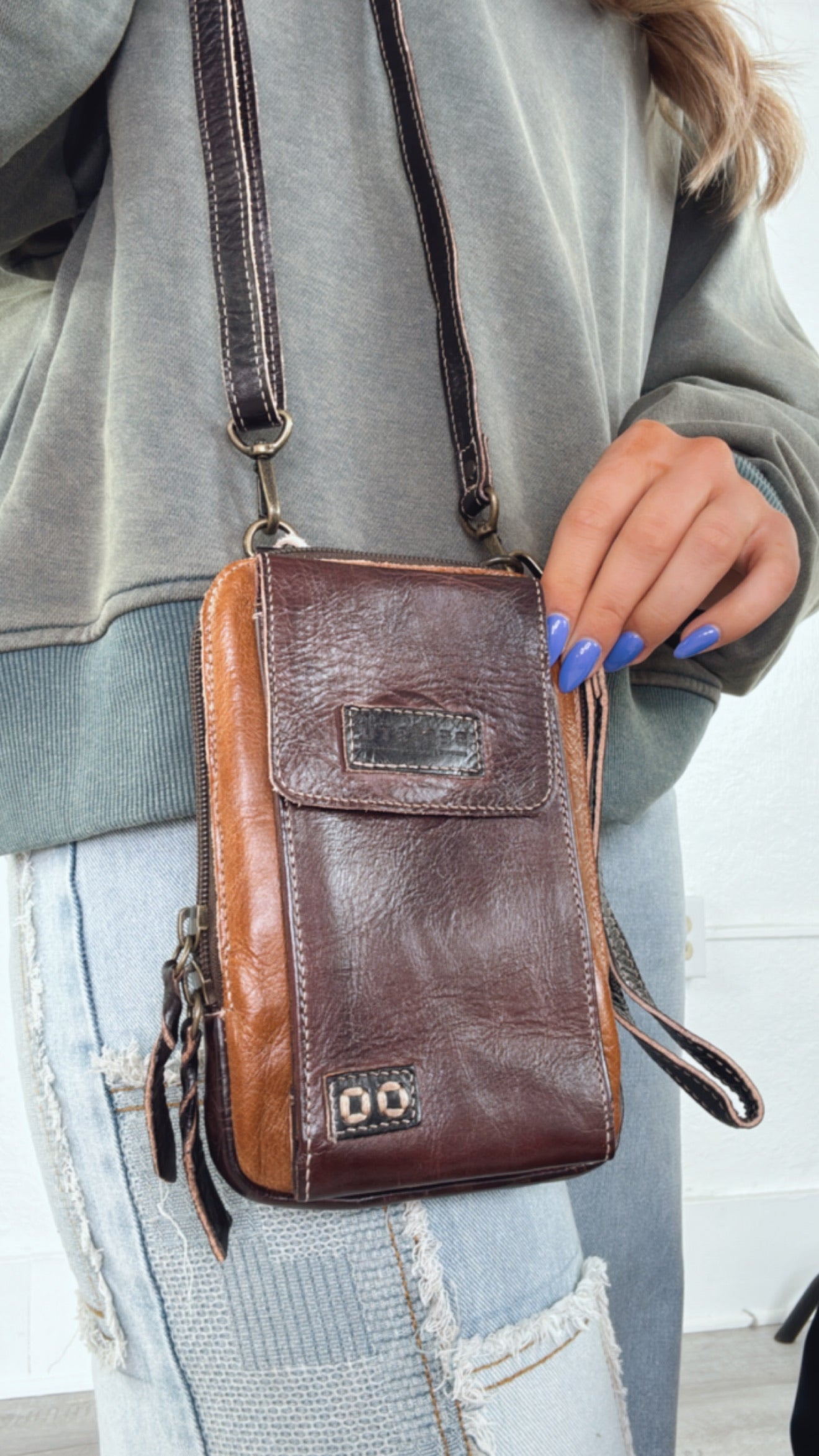 • Compact leather phone case and essentials holder, adjustable and removable strap