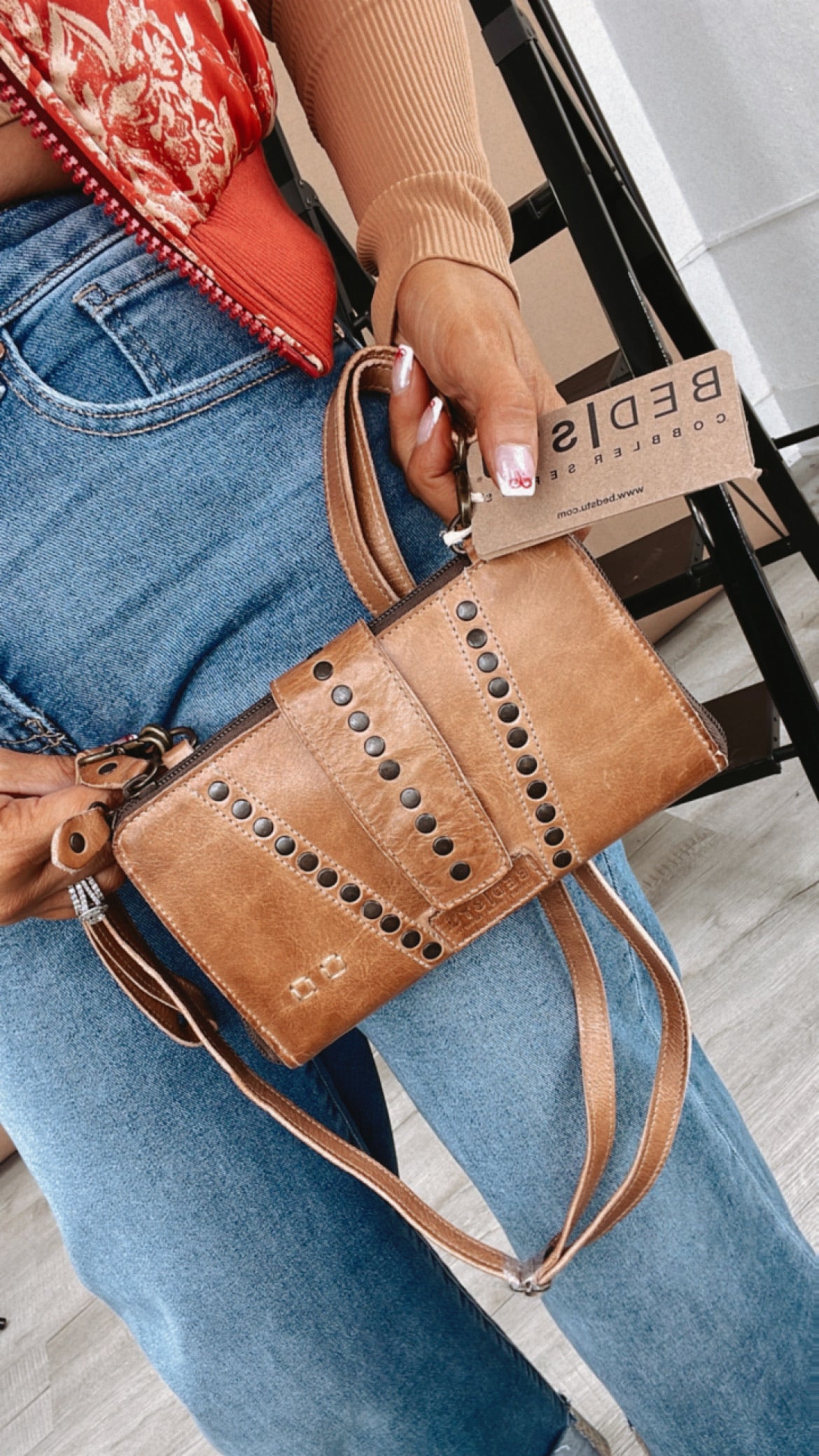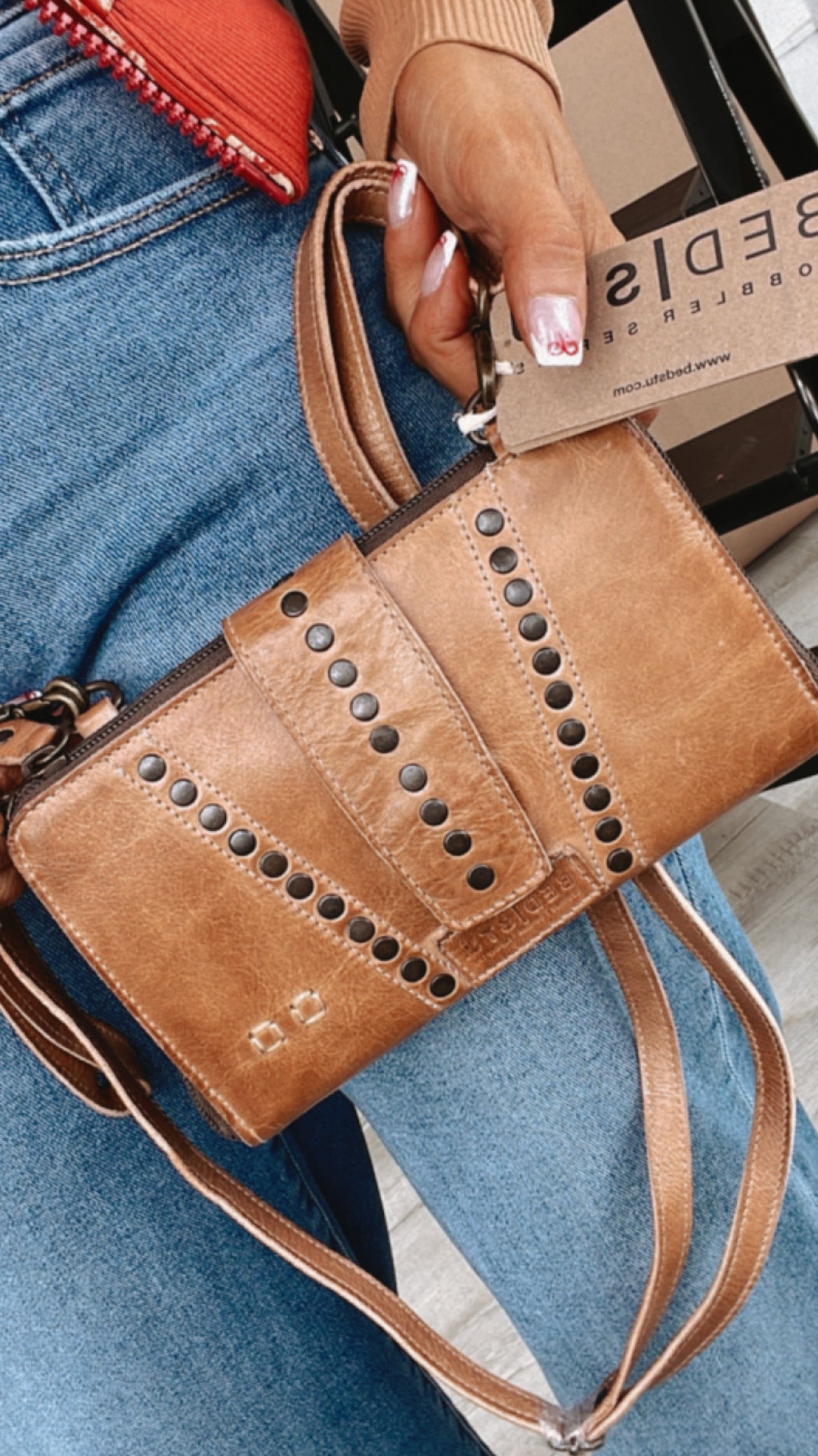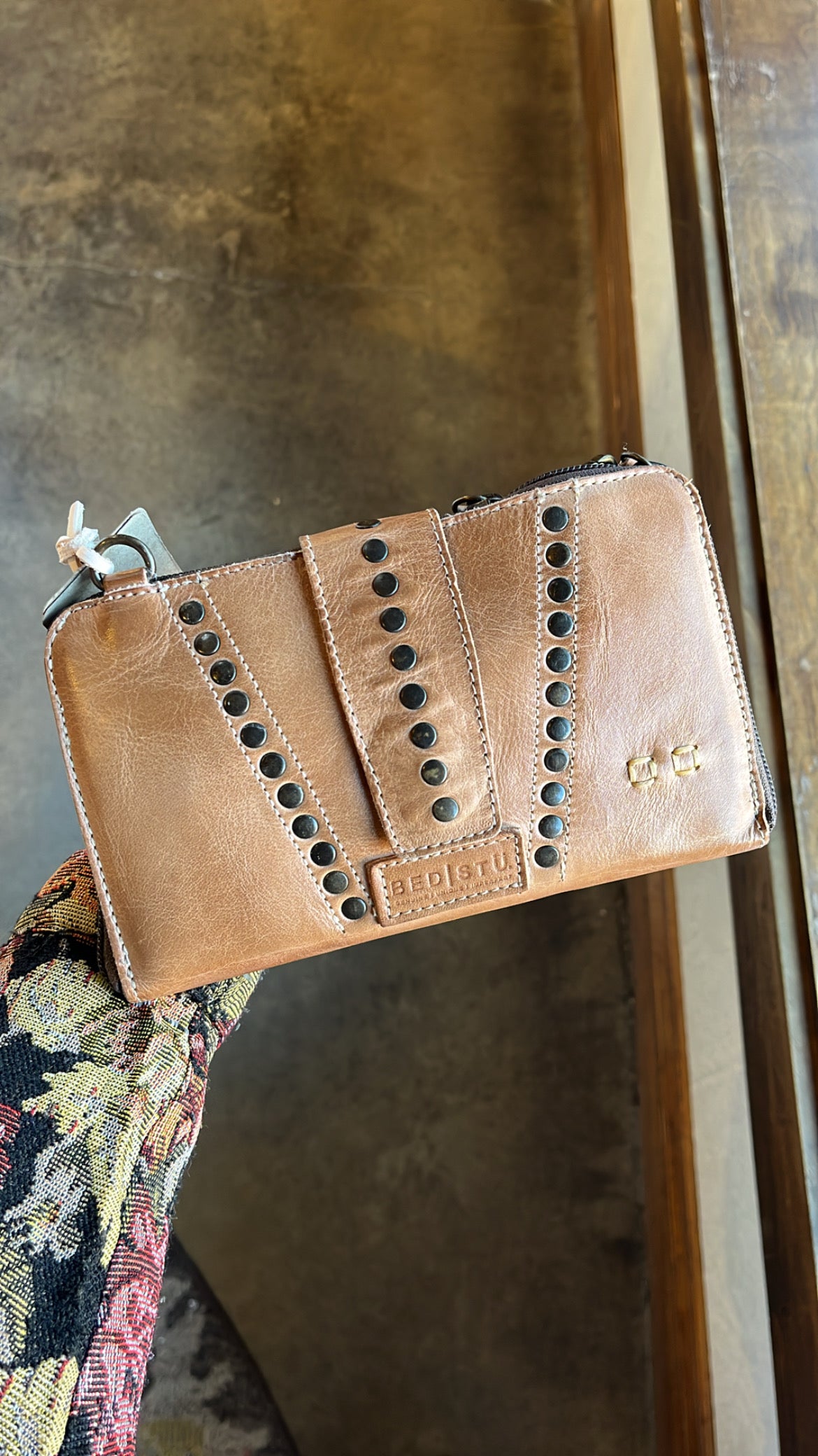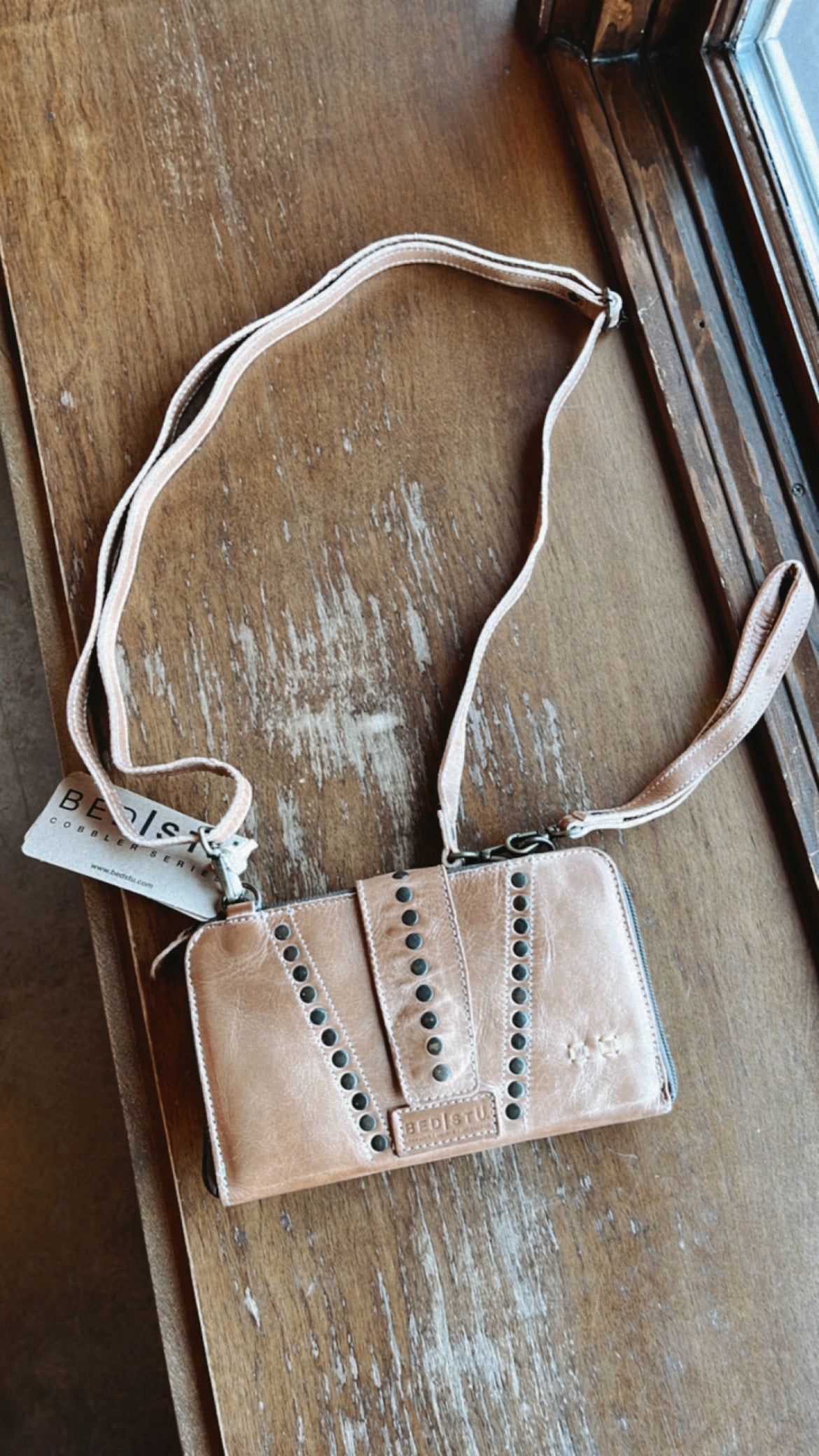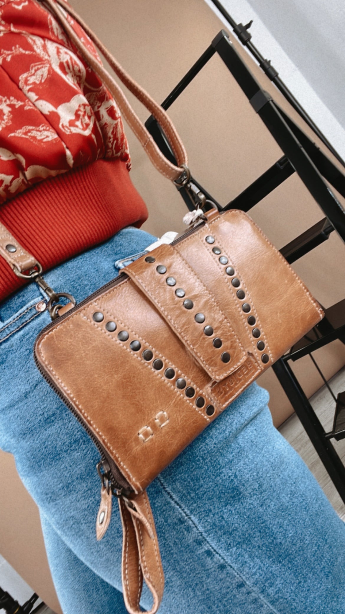 - Multi-purpose wallet and crossbody bag with stud details on front flap, adjustable and removable strap