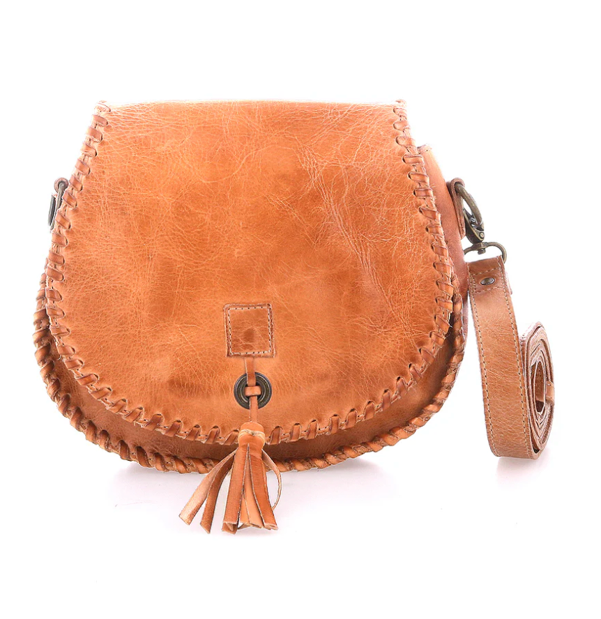 - Saddle bag shaped crossbody with playful leather tassel threaded through a metal grommet