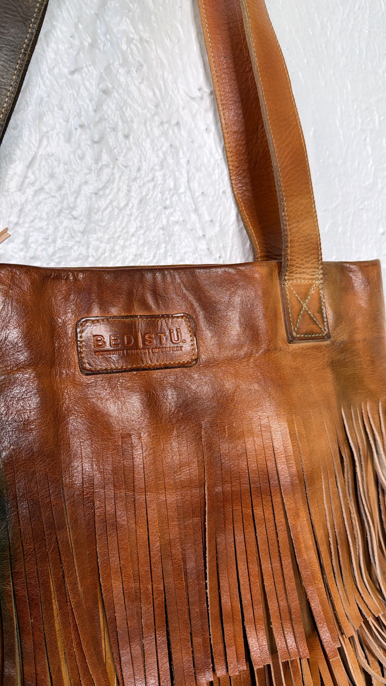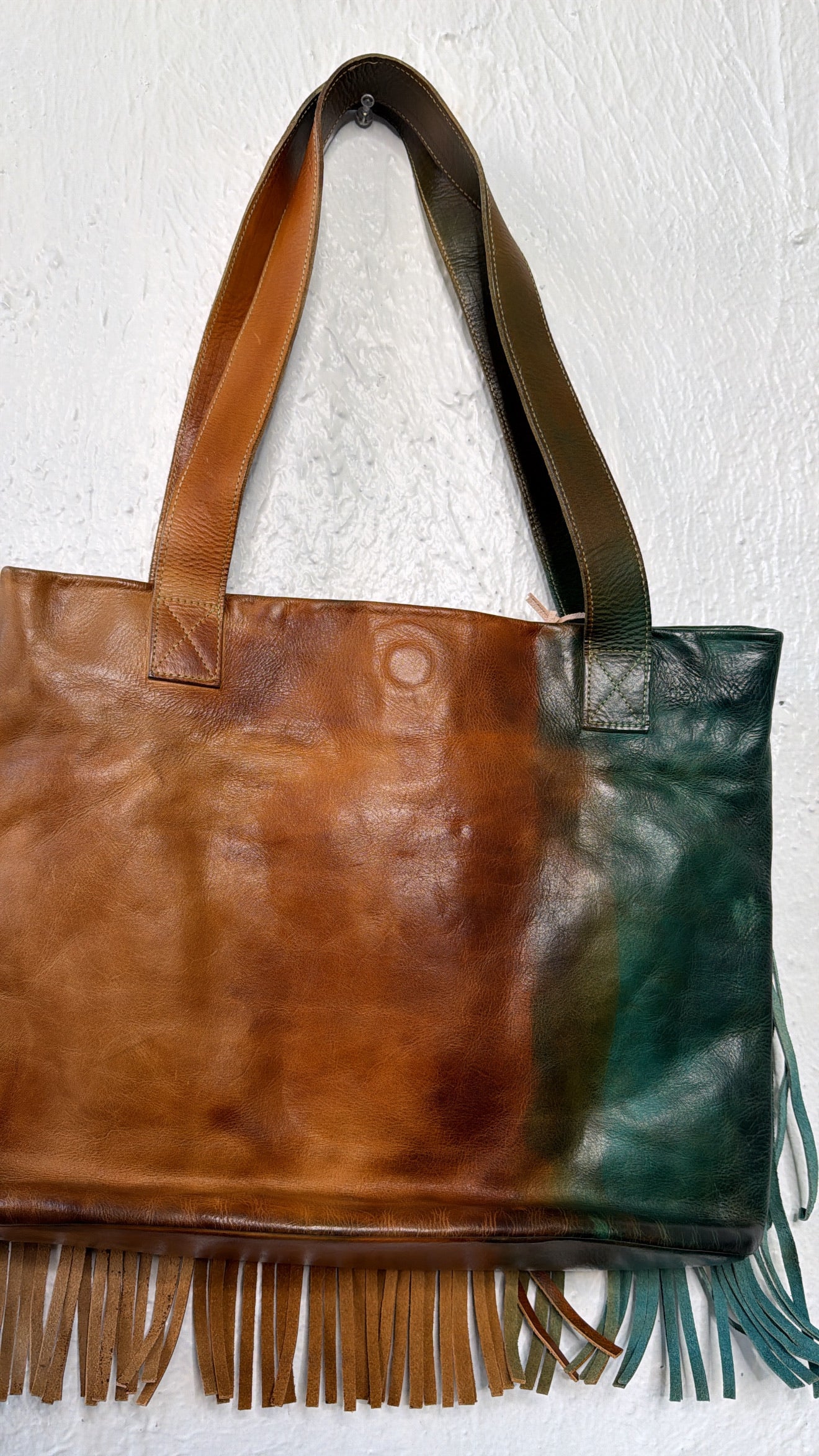 Genuine, hand-dyed leather with a two-tone fringe design