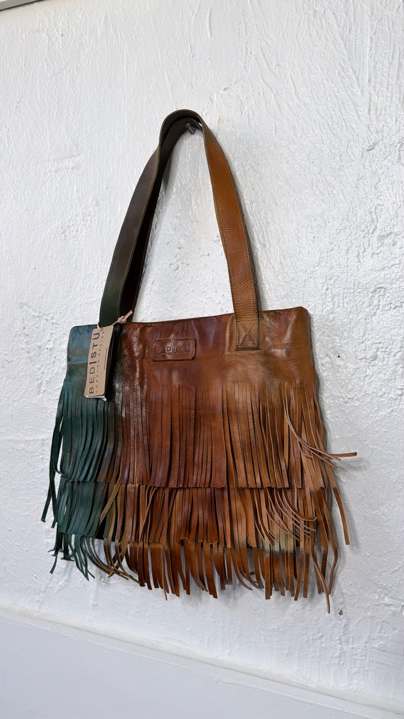 Make a bold statement with the Bedstu Rimes Tote, a stunning piece that combines bohemian spirit with artisan craftsmanship. Handcrafted from genuine leather, this tote features layered fringe detailing and a subtle ombré fade from rich cognac to deep forest green giving it a one-of-a-kind, free-spirited edge.