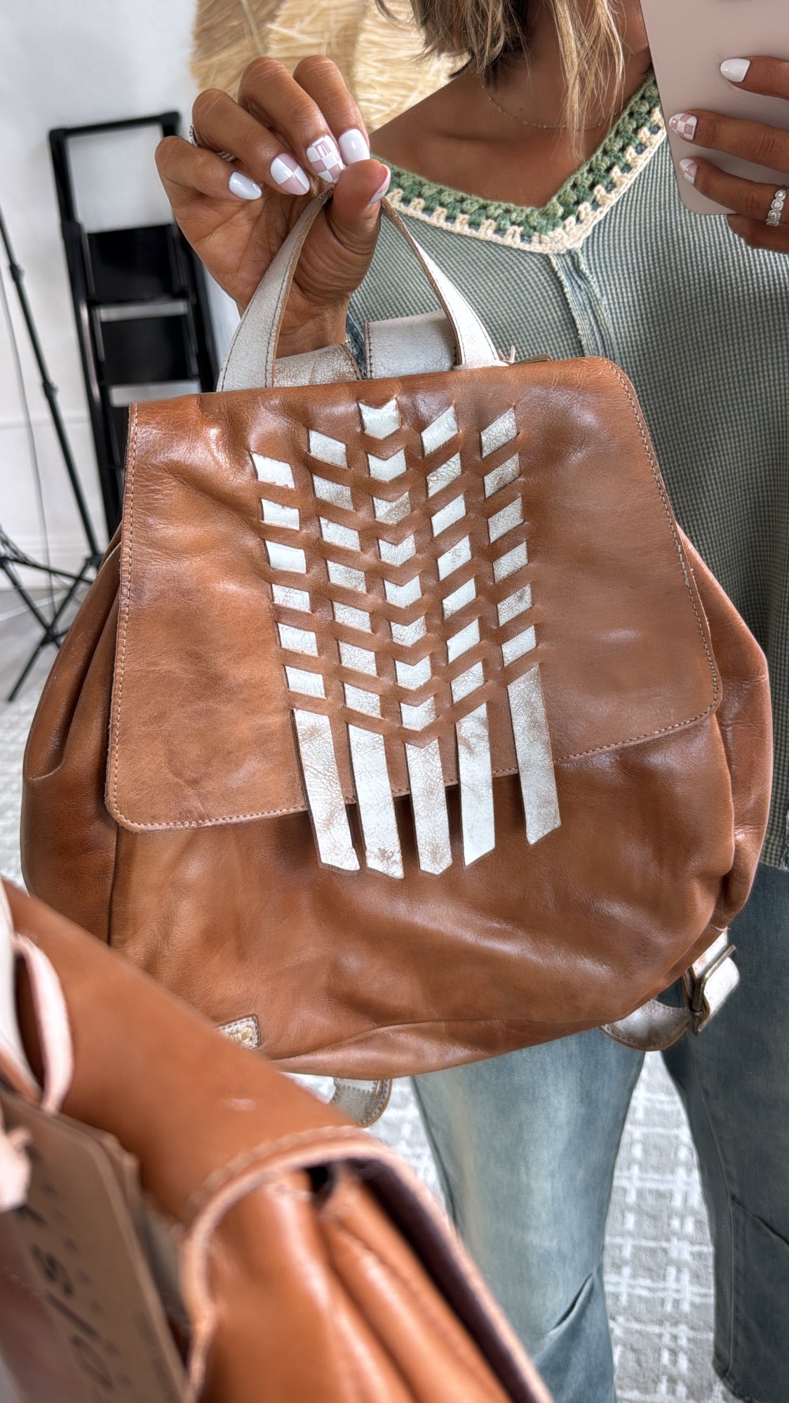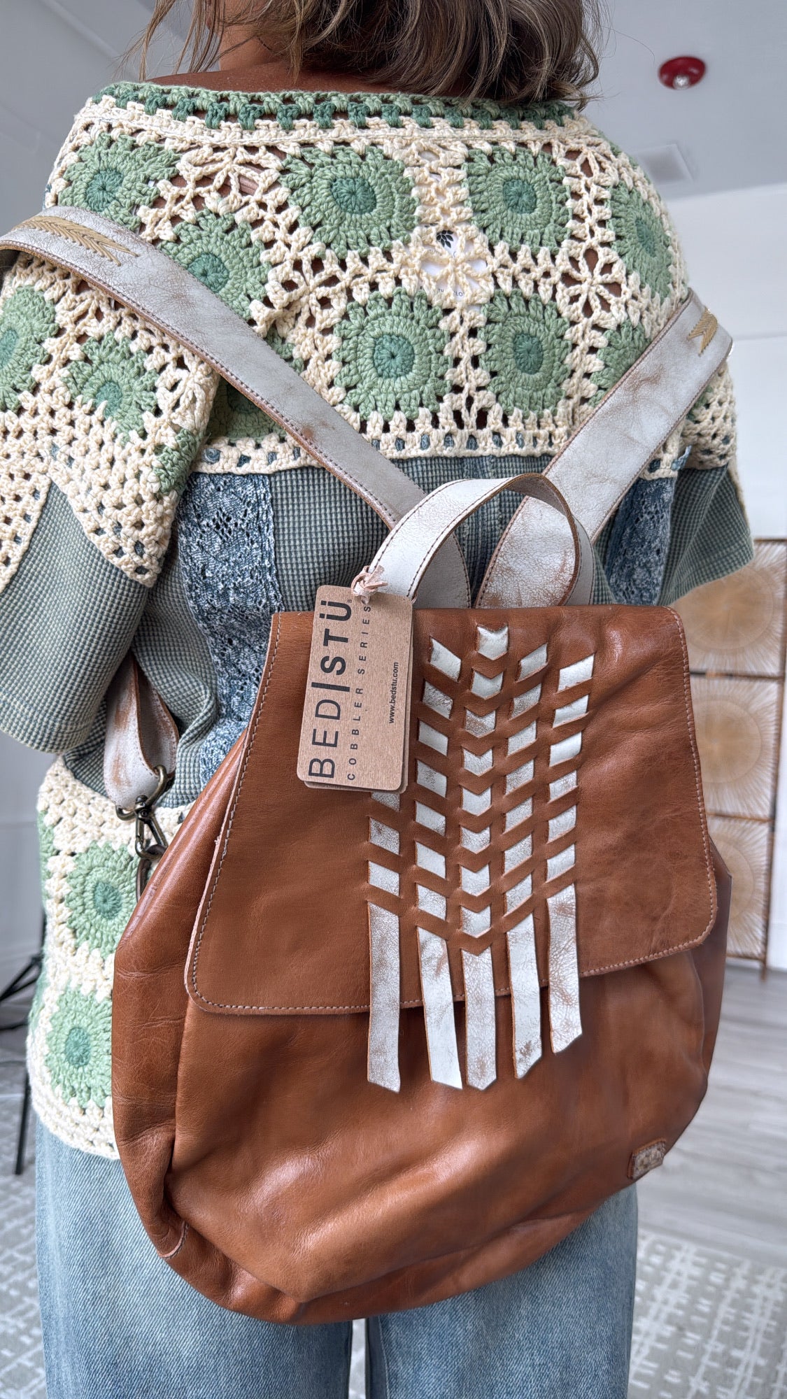 Where craftsmanship meets creativity, this backpack stands out with its striking handwoven detailing and soft, slouchy silhouette. Bold, woven fringe accents cascade down the front flap, giving it texture and movement, while wide, stitched shoulder straps ensure comfort and support. This backpack is a statement piece made to carry more than just the essentials.