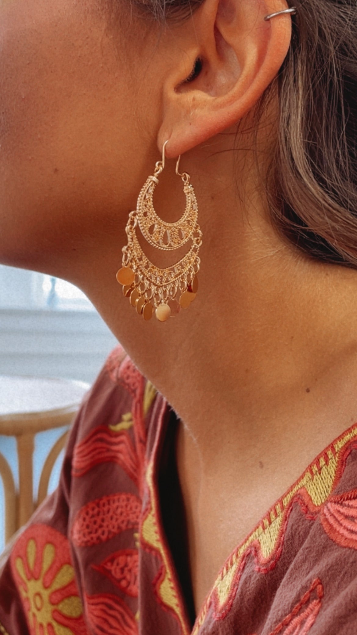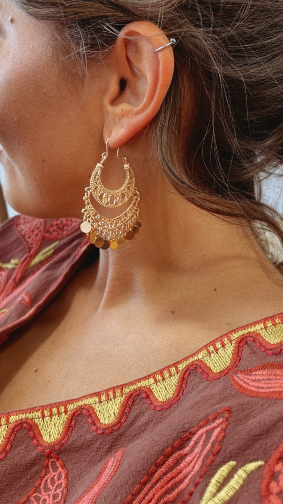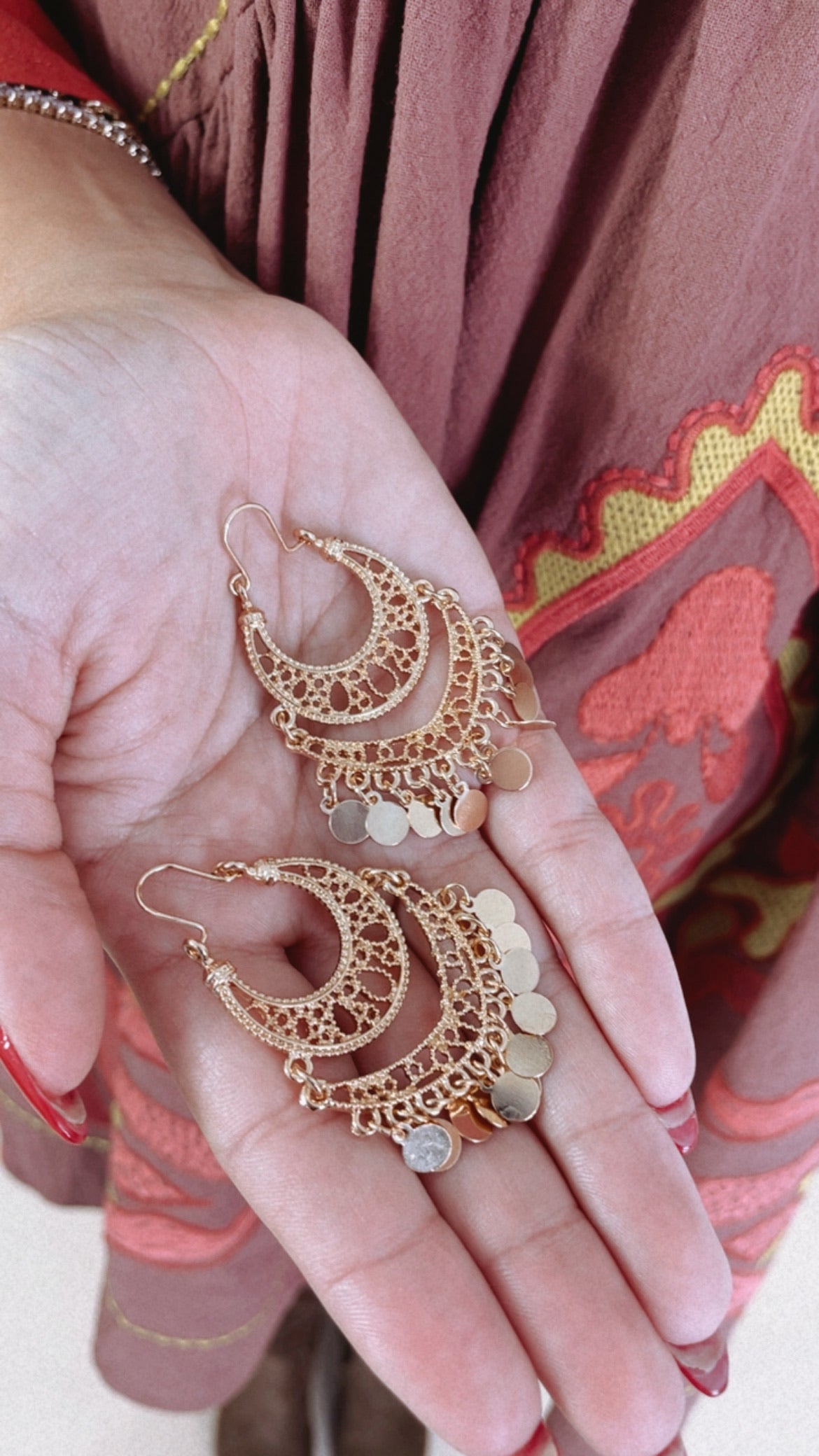 Elevate your boho style with these ethnic filigree hoops. Gold intricacy features coil dangles in a fusion of cultural allure and elegance.