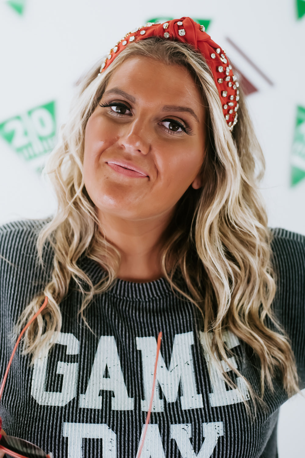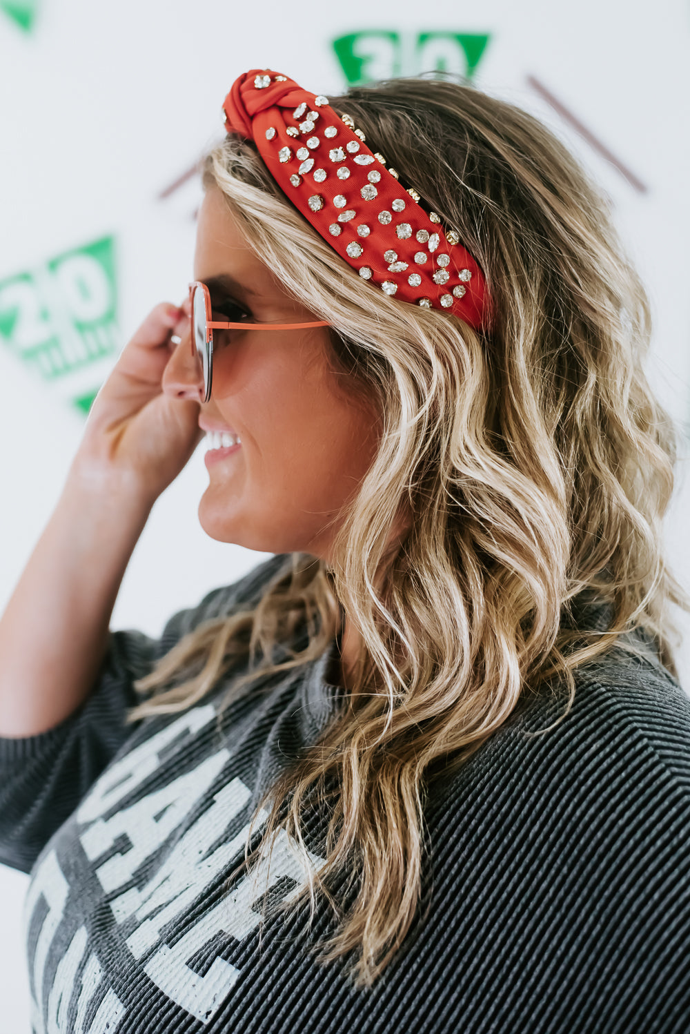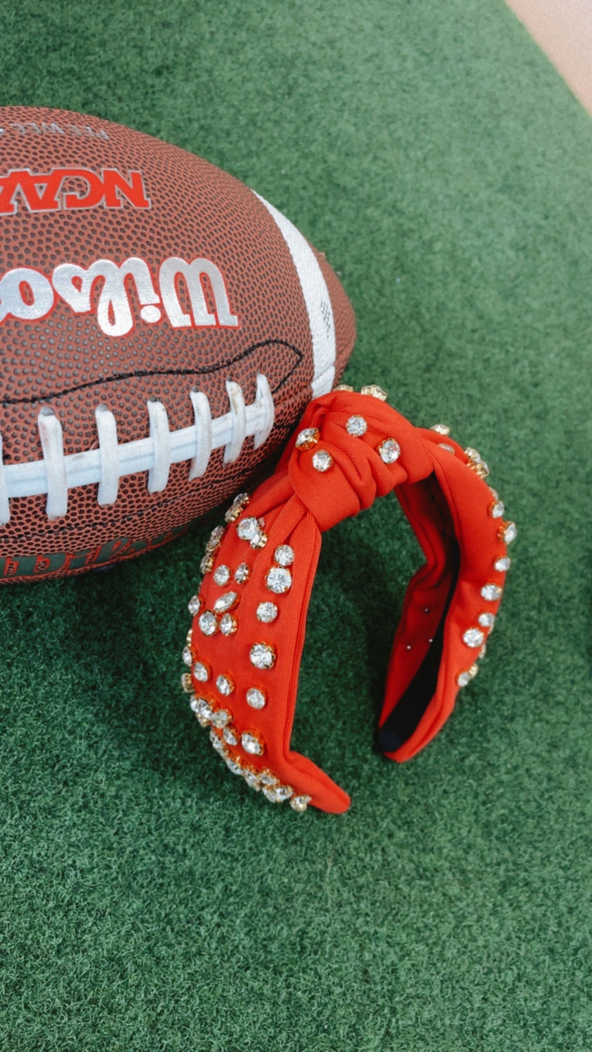 Complete your look with a touch of sparkle using the Rhinestone Headband in Orange, a dazzling accessory that adds a pop of glam to your ensemble, ideal for game days, College game day outfits, and stylish everyday wear.