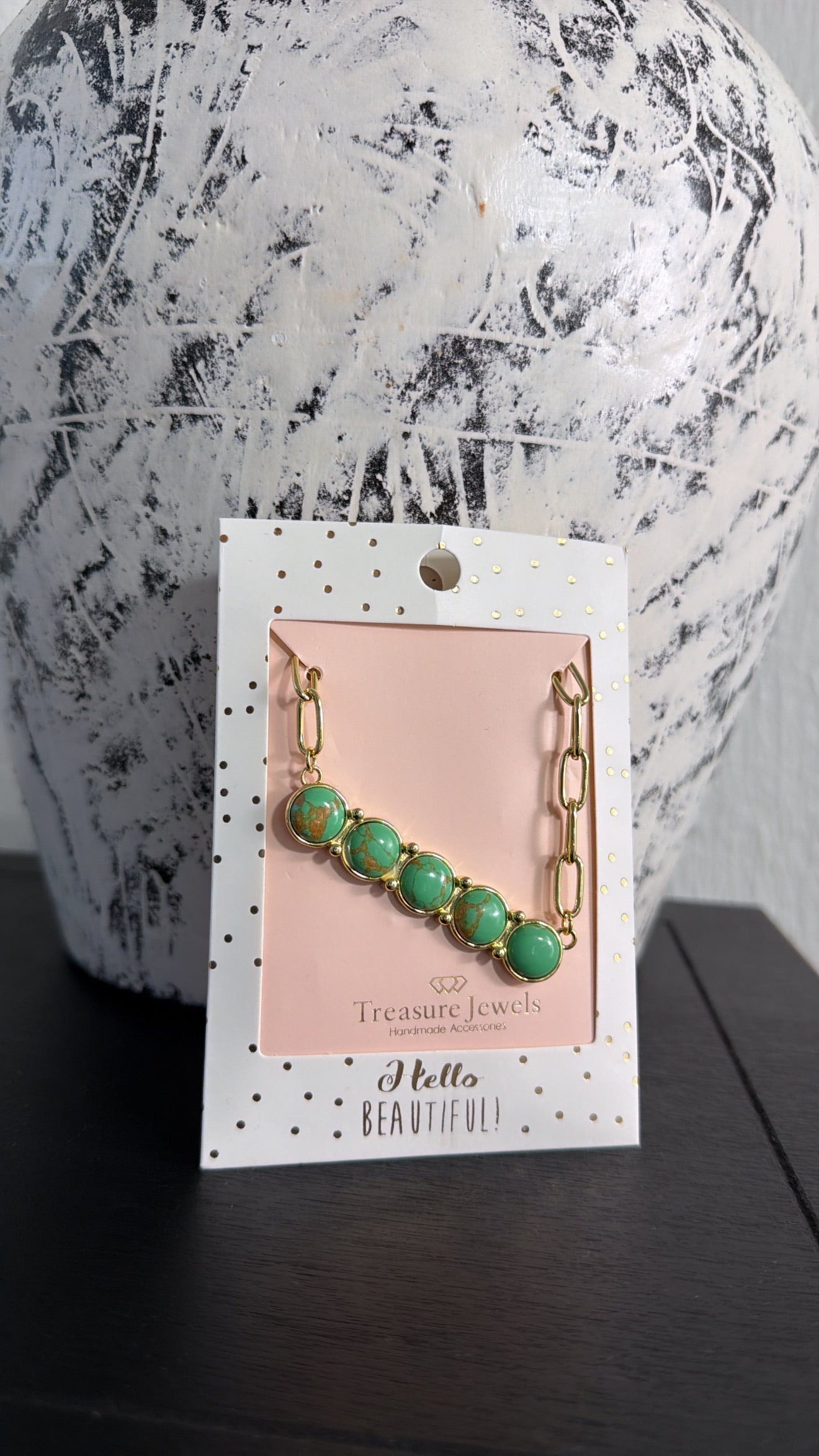 The Golden Oasis Necklace features a gorgeous green turquoise dotted line design on a gold chain.