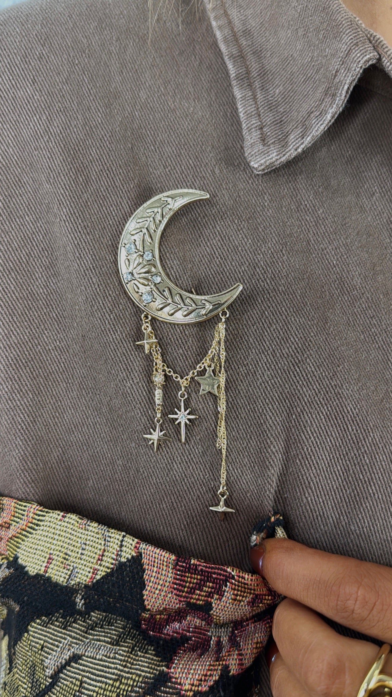 Crescent Moon Charm Brooch, Gold