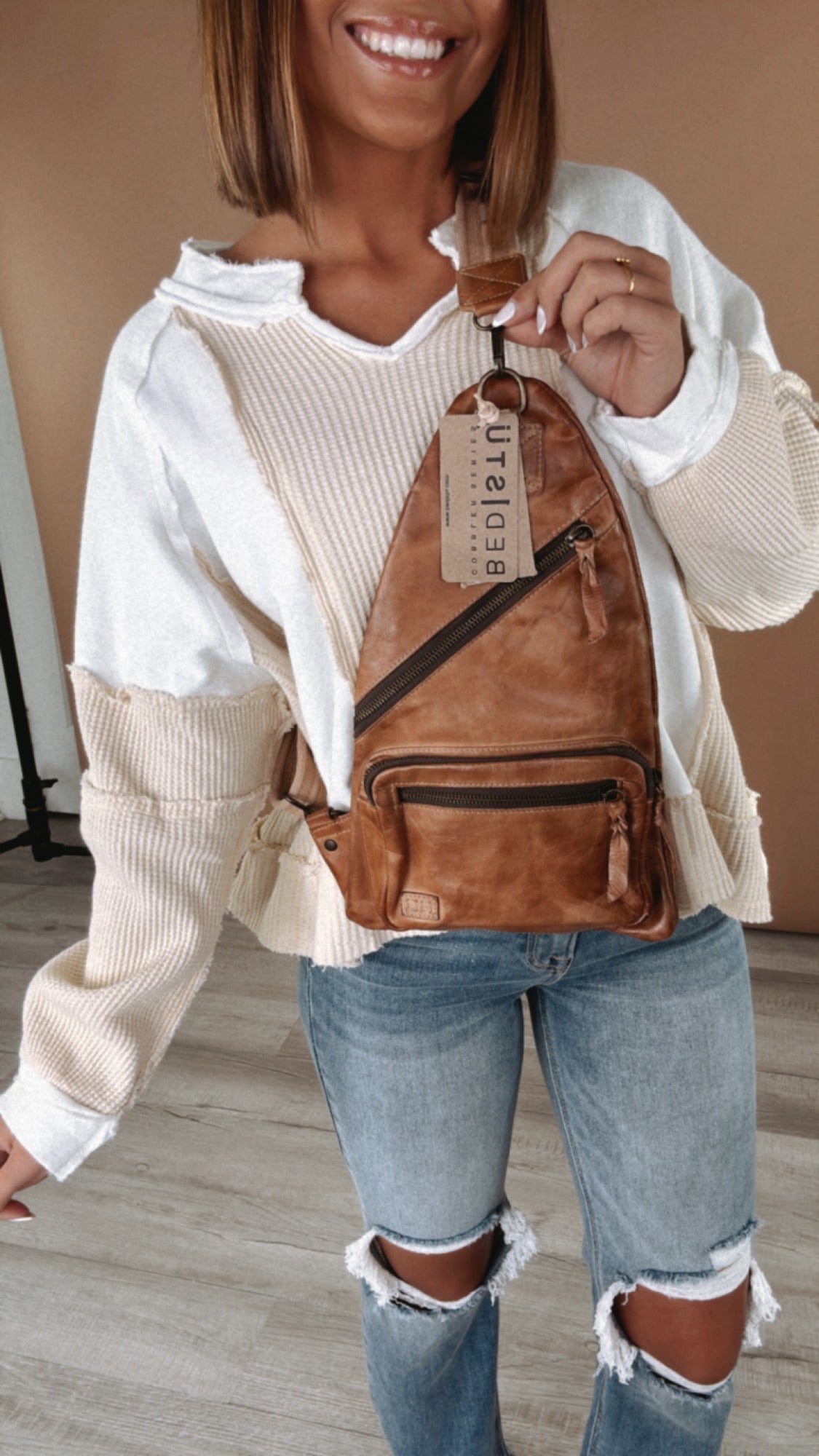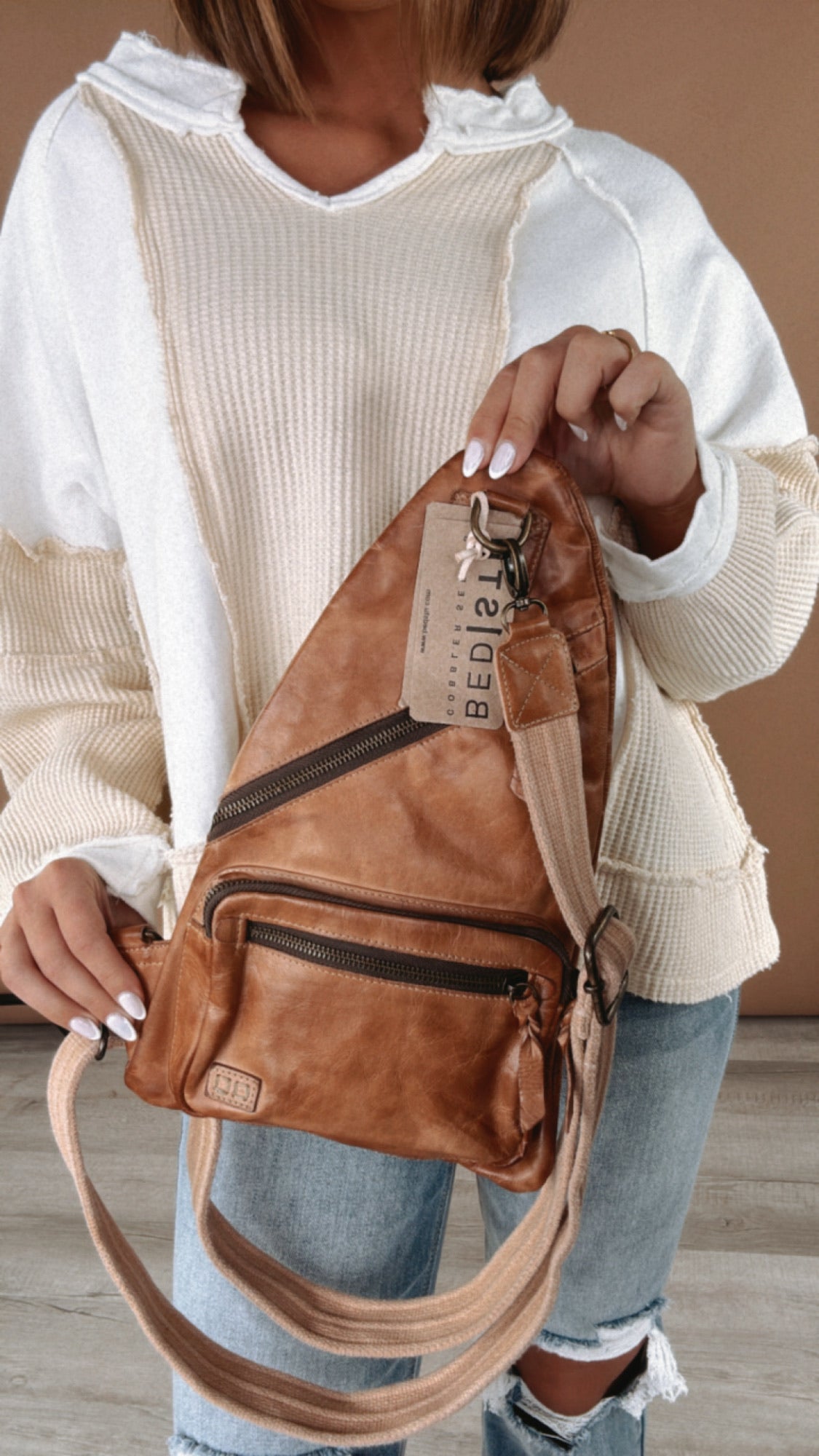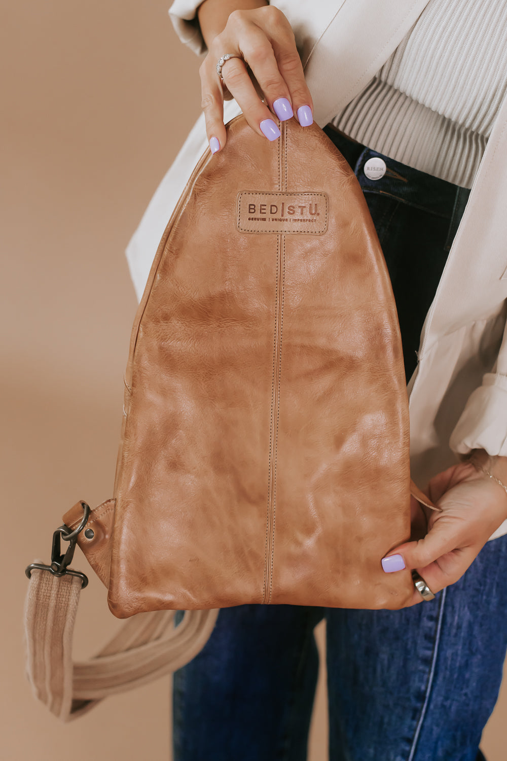 From Bed Stu, the Andie Tanned Leather Sling Backpack features: