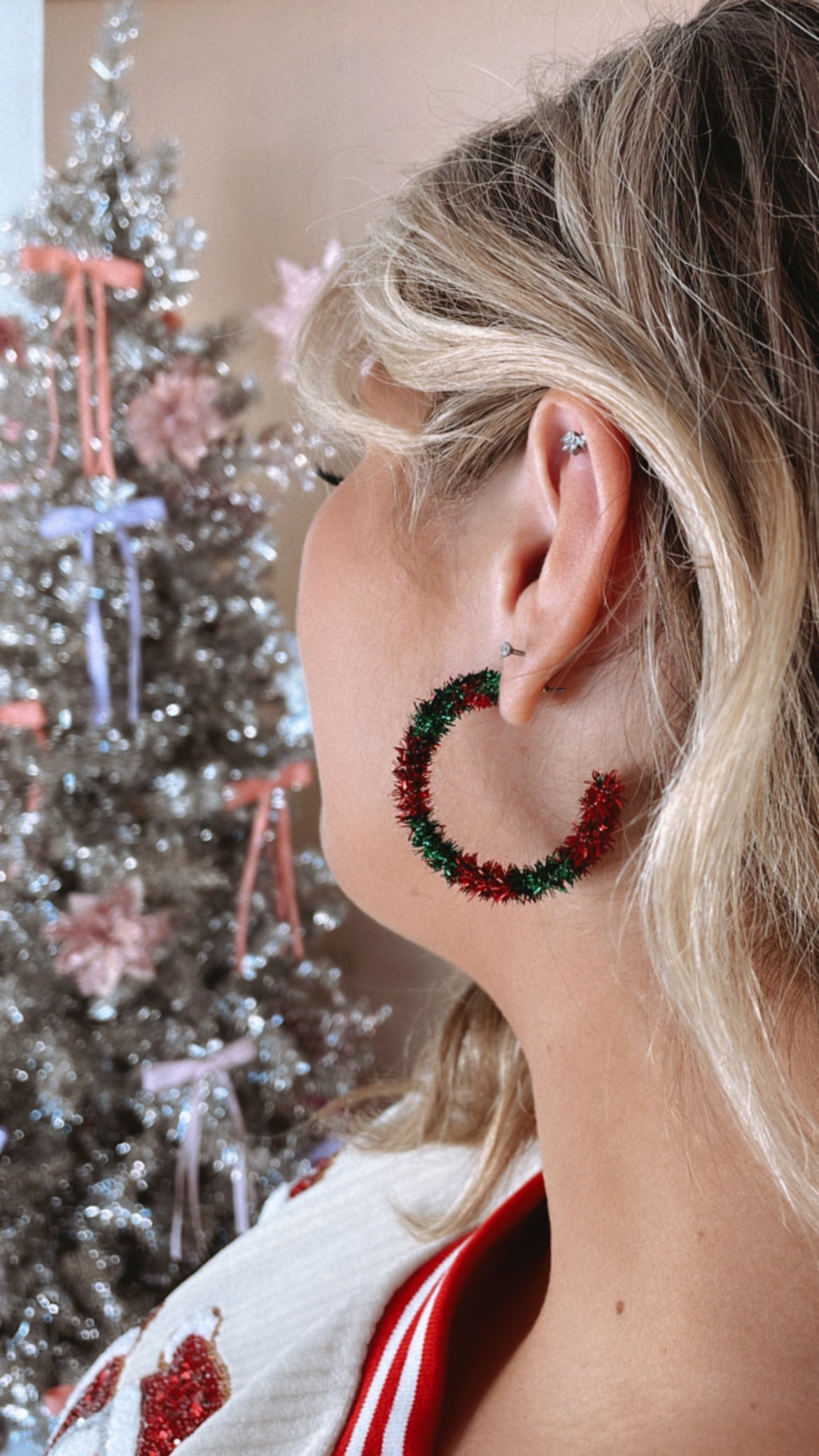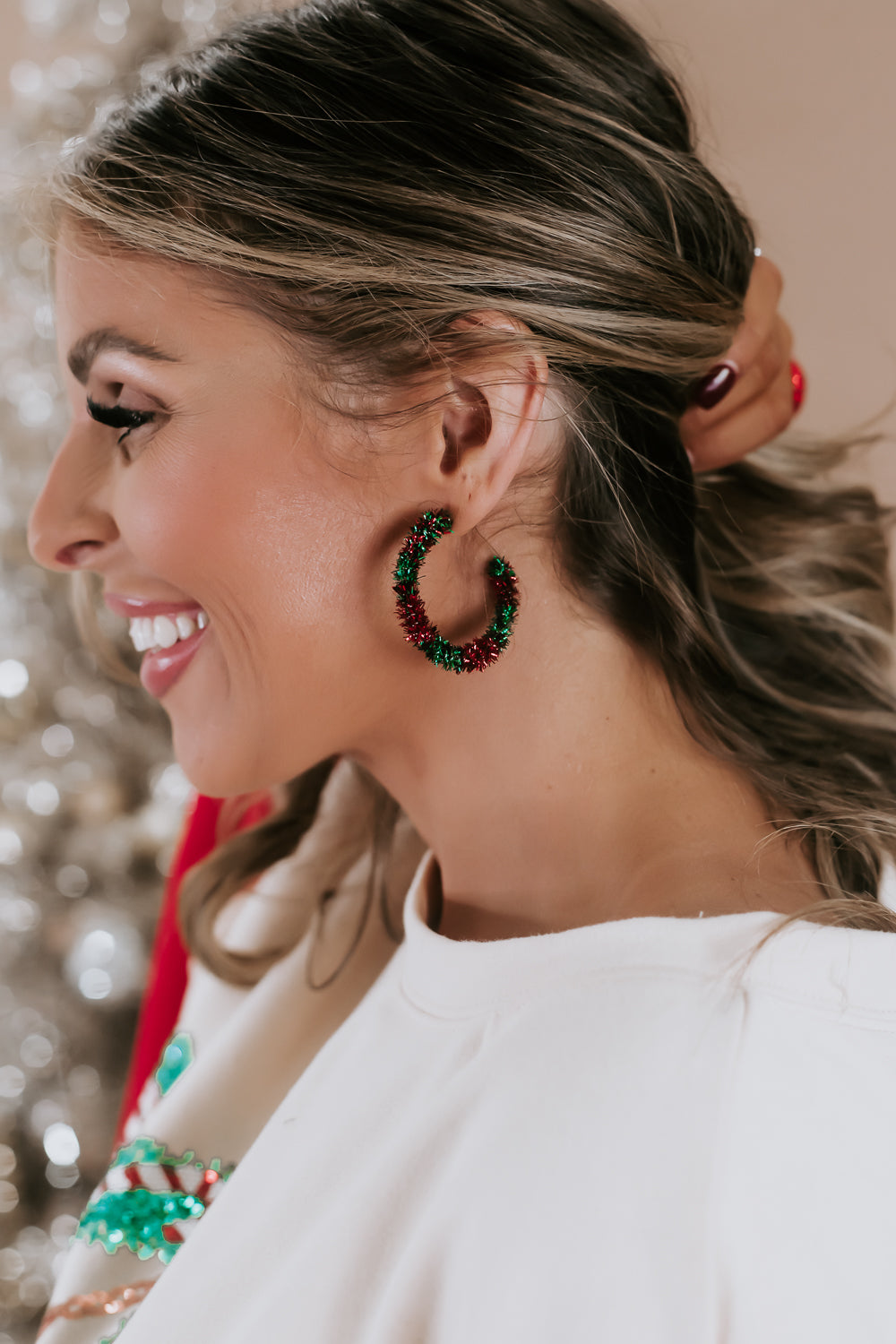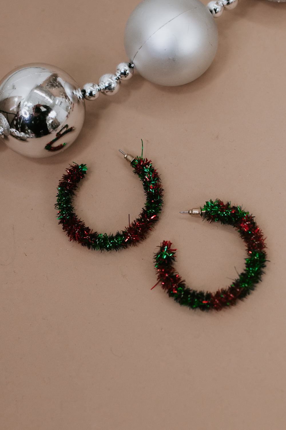 These playful earrings bring the holiday spirit to life with their wreath-inspired design adorned with cheerful tinsel. Perfect for adding a pop of color to your holiday outfits, these hoops capture the joyous essence of Christmas.